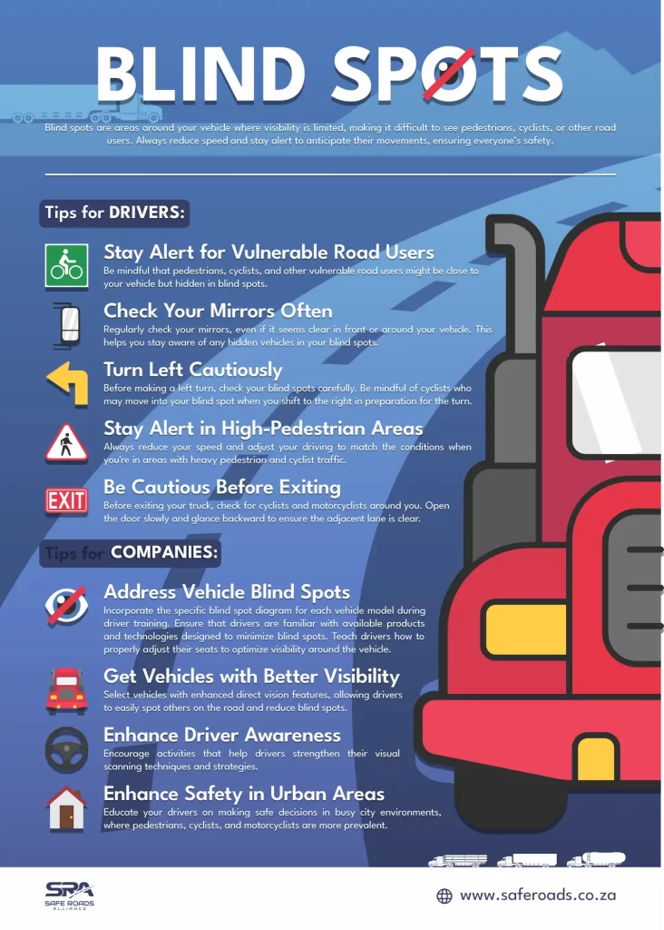 The SRA Blind Spots poster delivers a strong and practical road safety message: blind spots can hide danger, but smart habits can reduce risk. Its advice to drivers and companies is clear, relevant, and highly practical for South African roads.